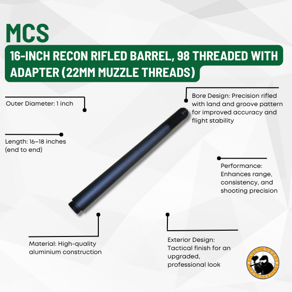 Built for performance and precision, the 16-Inch Recon Rifled Barrel delivers outstanding accuracy and reliability on the field. Its rifled design and durable build make it the perfect upgrade for serious players looking to boost both the look and performance of their marker.