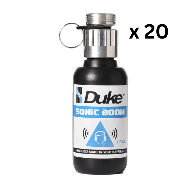 The Duke Sonic Boom has been proudly developed and patented in South Africa. The Duke Sonic Boom has a detonation time of approximately 4-5 seconds, which offers the thrower enough time to lob the device into the desired area, but not enough time for the targets to escape.