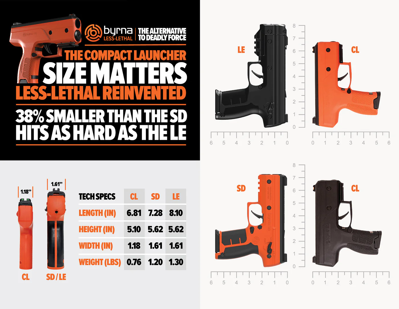 The Byrna CL (Compact Launcher) is the most compact less-lethal launcher in the world. The entire platform has been reimagined for maximum concealability and stopping power. Powered by compressed air (CO2), the Byrna CL shoots .61 caliber round kinetic and/or chemical irritant projectiles that can disable a threat from up to 60-feet away.