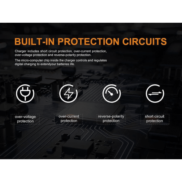 The Fenix ARE-D2 Battery Charger is designed with safety in mind, featuring short circuit protection, over-current protection, over-voltage protection, and reverse-polarity protection. These safety measures ensure the protection of both the charger and your batteries during the charging process. Moreover, the charger employs micro-computer chip-controlled, digitally regulated charging to extend the lifetime of your rechargeable batteries.