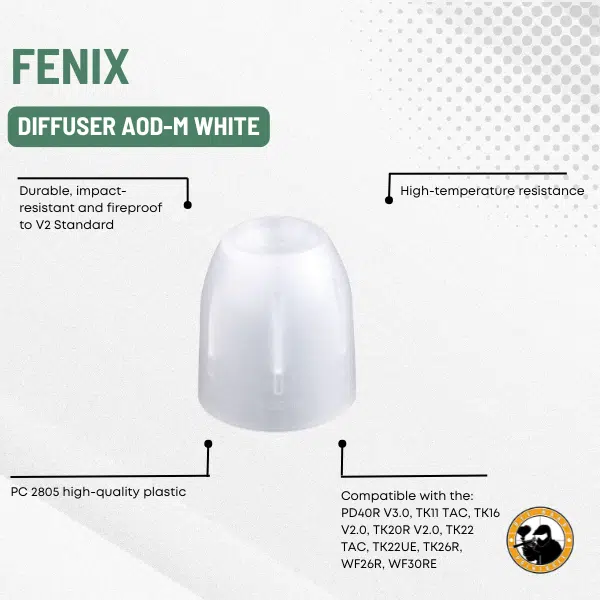 Fenix Diffuser AOD-M White – Transform your Fenix light into a reading, signal or emergency light. Attachment is quick and secure with materials designed for field use. Innovative design allows the tip stand to stand on any flat surface.