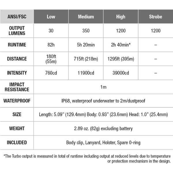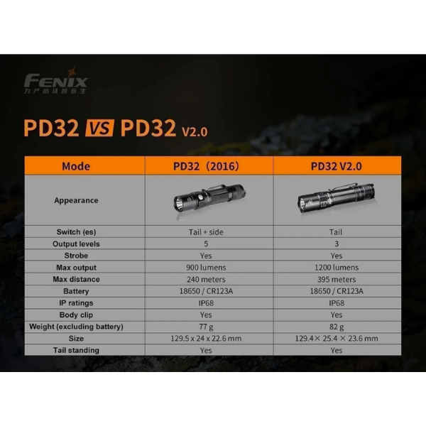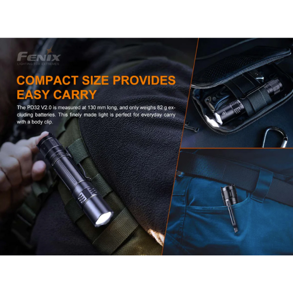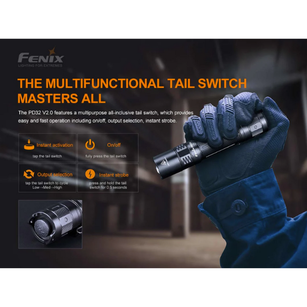 Compact, powerful, and built to perform, the Fenix PD32 V2.0 Flashlight is the ultimate all-purpose light for everyday use or professional duty. With 1200 lumens, impressive beam distance, and intuitive tail switch operation, it delivers reliable performance in any situation. Durable, lightweight, and easy to carry, the PD32 V2.0 is a dependable companion for outdoor adventures, emergency use, or tactical operations.