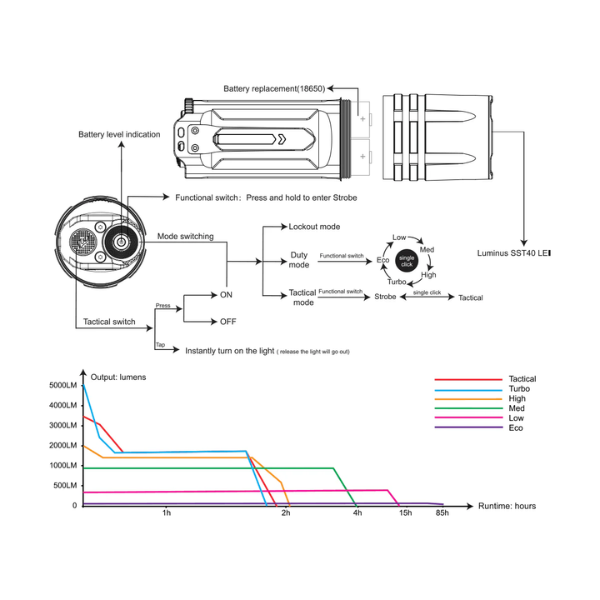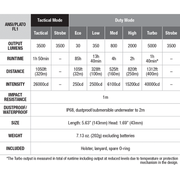 • Lighting Modes: Turbo and strobe in Tactical mode. 5 brightness levels plus strobe in Duty mode.
