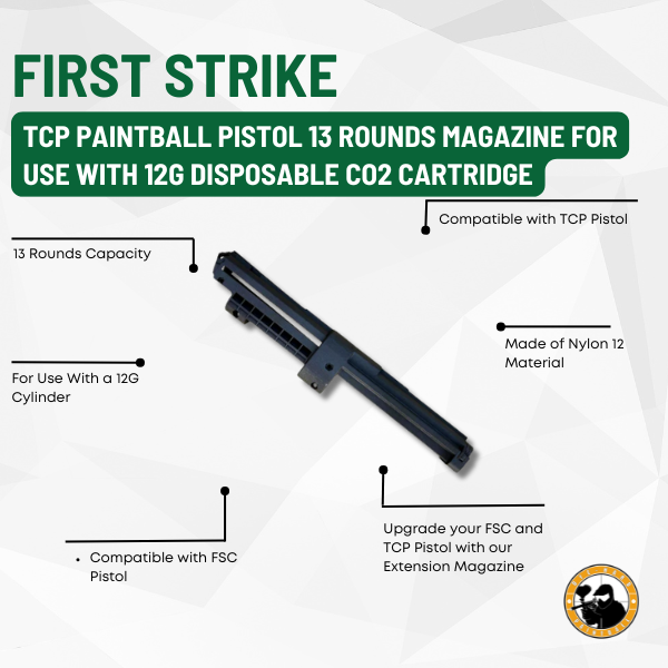 The First Strike TCP 13-Round Extension Magazine is a simple yet powerful upgrade for FSC and TCP pistol users who want increased capacity and reliable CO2 integration. With space for a 12g disposable cartridge and durable Nylon 12 construction, it delivers smoother performance, longer shot strings, and greater convenience during use. Whether for training, recreational shooting, or tactical applications, this magazine extension provides a dependable, high-quality enhancement to your setup.
