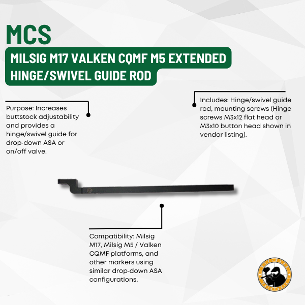 If you need extra buttstock adjustability or a neat, secure way to mount a drop‑down ASA/on‑off valve, this extended hinge/swivel guide rod is an inexpensive, easy install solution for Milsig and compatible Valken markers. It’s a small part that can make stock and air‑system changes quicker and cleaner on the field.