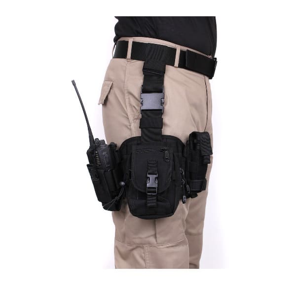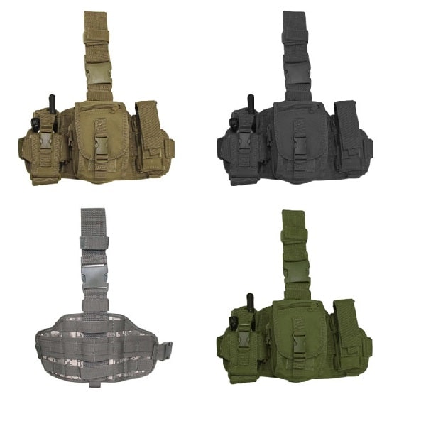 Molle Utility Leg Rig – This modular leg rig comes with three detachable pouches: a radio pouch, a flashlight/pistol mag pouch, and a utility pouch. The non-slip padded drop leg platform includes MOLLE/PALS webbing for attaching pouches and accessories. The leg rig has a fully adjustable leg strap and vertical strap with quick-release buckles.