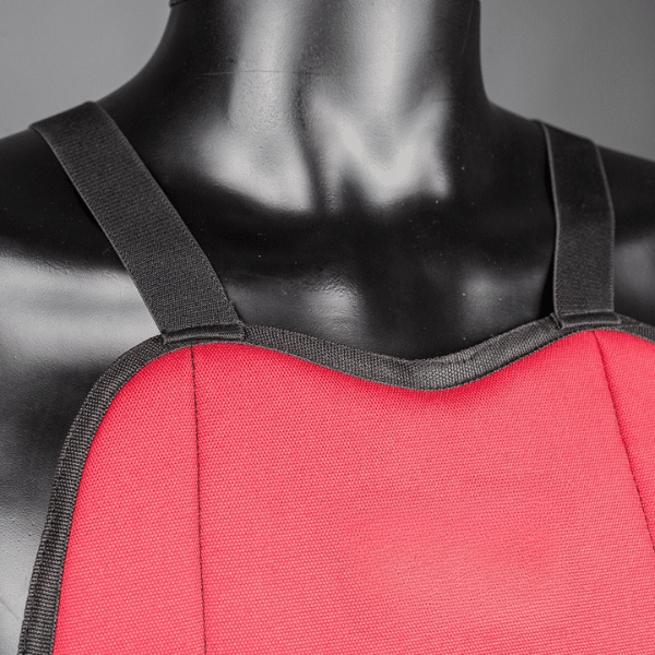 It can be switched from red to blue, making it easy to spot two opposing teams. The reversible chest protector has Velcro strips to which pockets for so-called pots can be attached for additional paintballs.