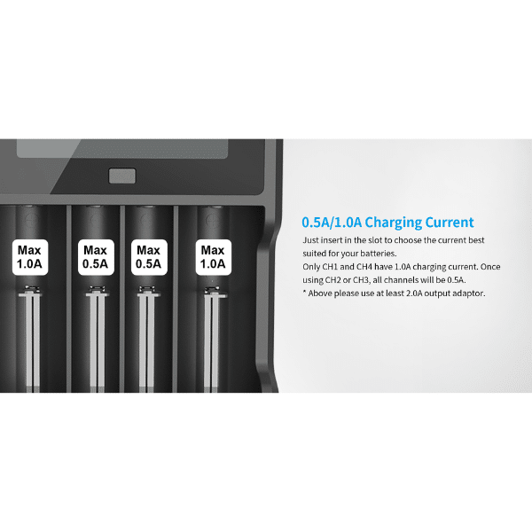 Only CH1 and CH4 have a 1.0A charging current. Once using CH2 or CH3, all channels will be 0.5A.