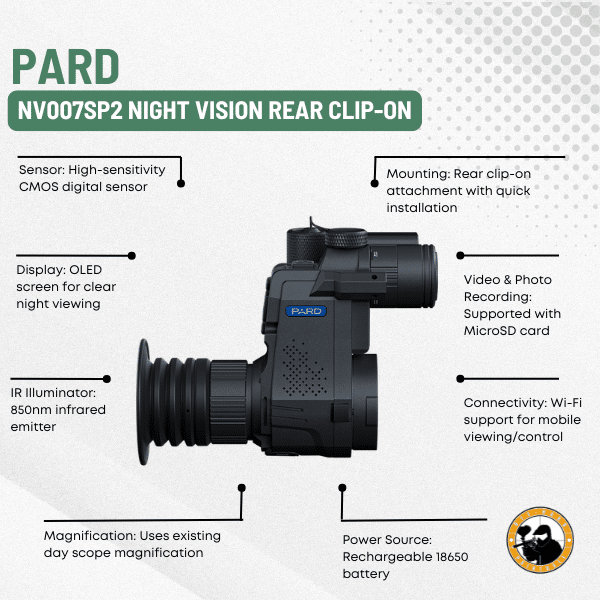The Pard NV007SP2 Night Vision Rear Clip-On is a compact digital night-vision attachment designed to transform a traditional daytime riflescope into a capable night-shooting system within seconds. Built as the evolution of the popular NV007 series, this unit delivers improved image clarity, enhanced detection range, and user-friendly mounting.