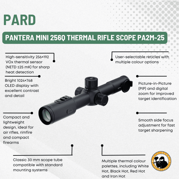 The Pard Pantera Mini 256Q Thermal Rifle Scope PA2M-25 is a compact and highly capable thermal riflescope designed for pest control and hunting with air rifles, rimfire and small-caliber firearms. Its traditional 30 mm tube design preserves the balance and appearance of a daytime scope, while advanced thermal technology enables fast and accurate target detection in complete darkness and challenging weather conditions.