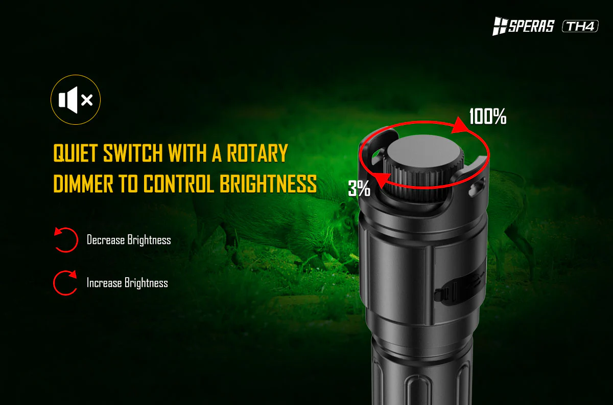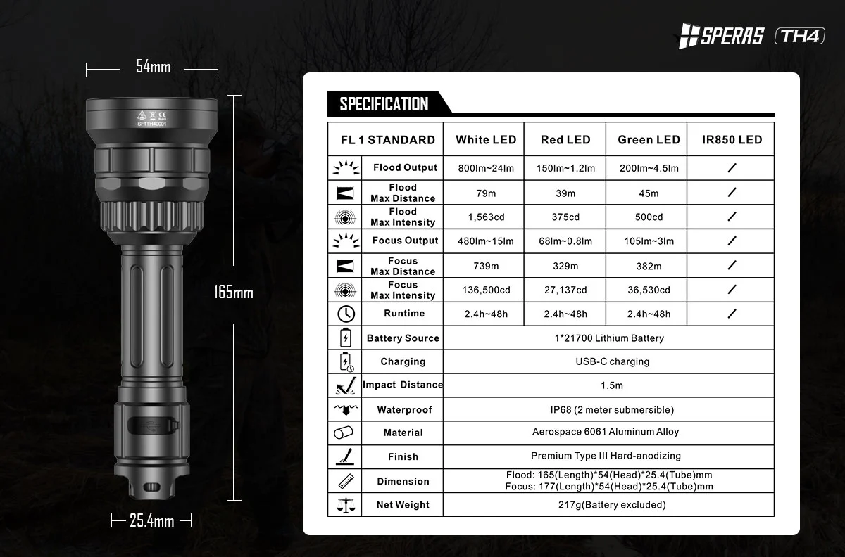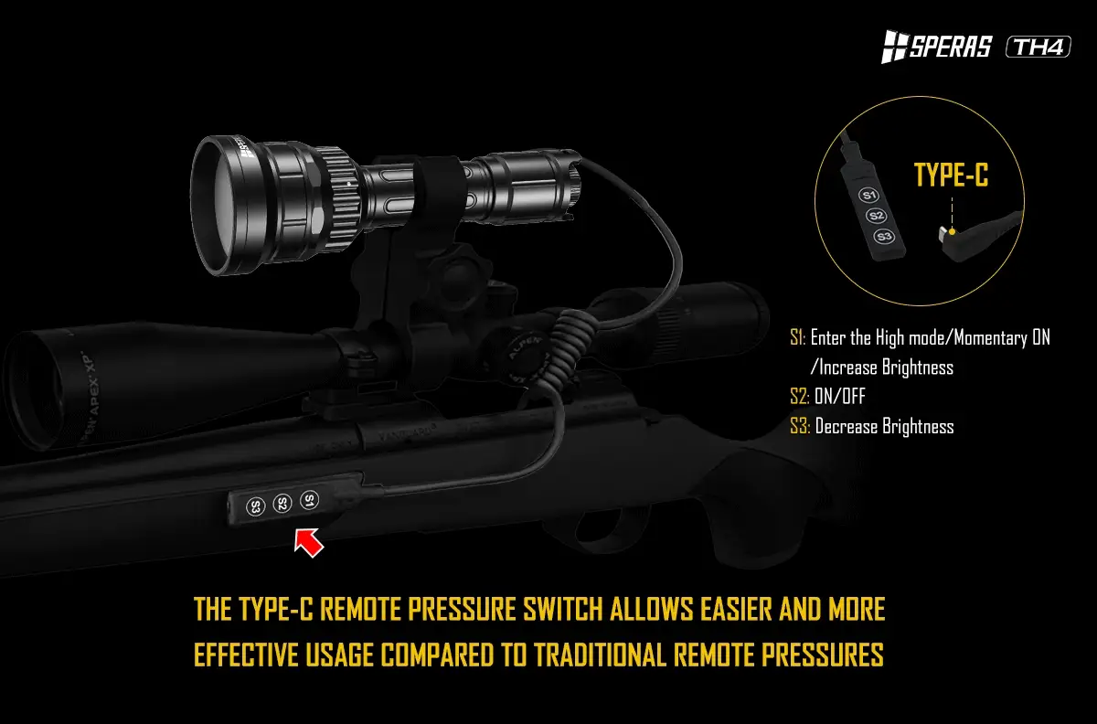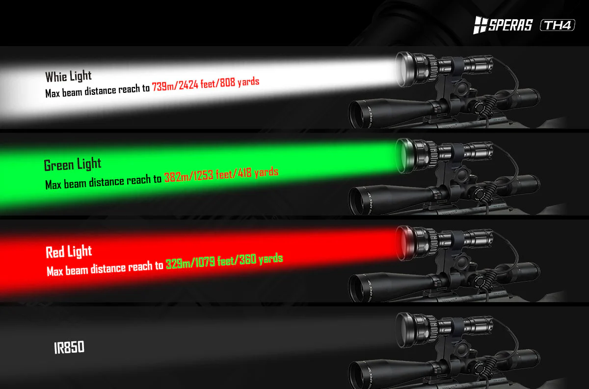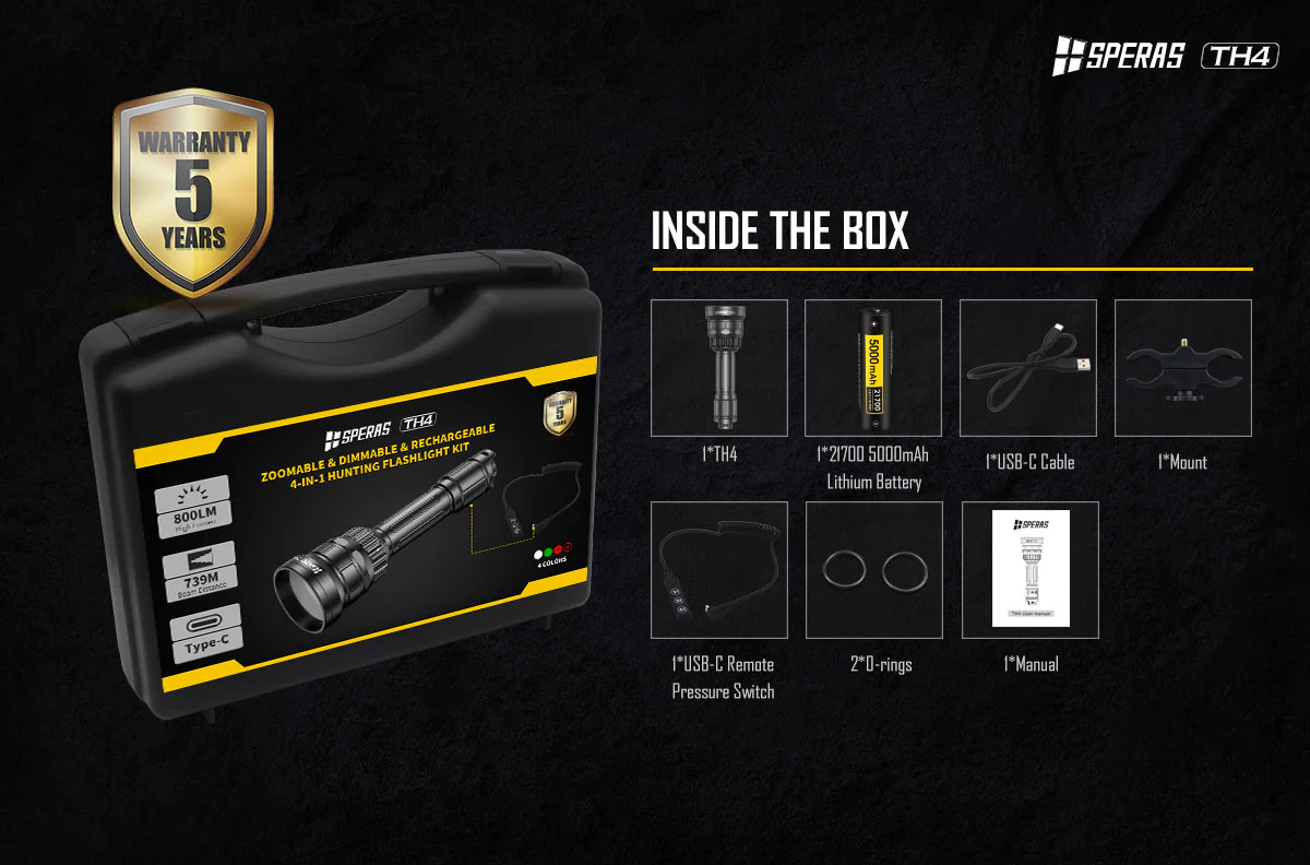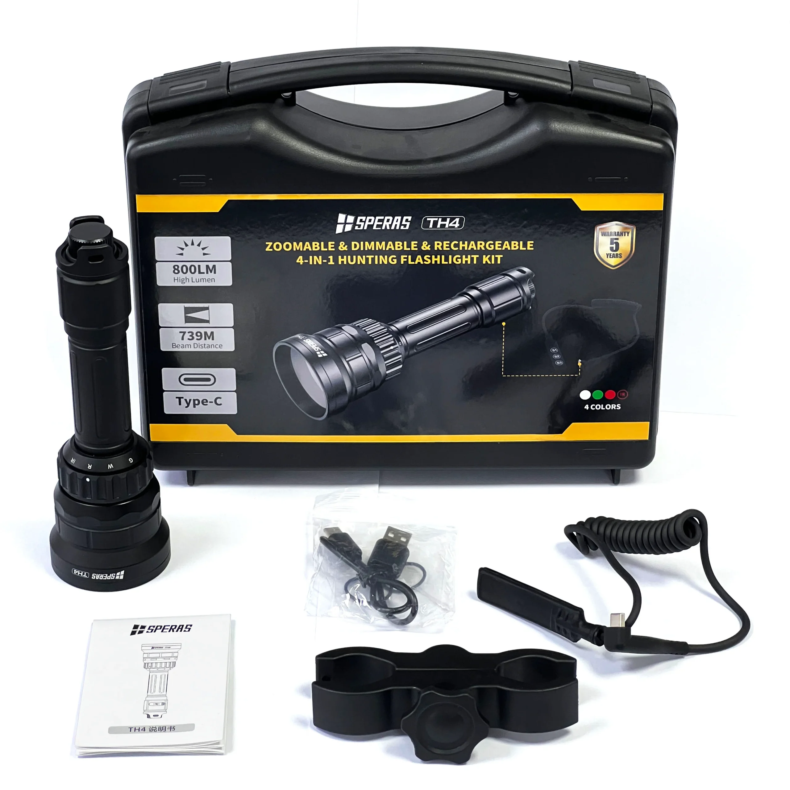 Speras TH4 Hunting Flashlight is specially designed for hunters with 4 colour LED sources(White, red, green, IR850) in one flashlight, which allows you to instantly change the LED by rotating the switch to meet different targets in various hunting applications. It is an adjustable focus from flood beam to focus beam and allows changing the brightness to help hunters choose the required light. The Type-C charging and USB-C remote pressure switch share the same port to provide convenient operation. It also includes a 21700 5000mAh premium rechargeable battery to keep your light running all night long. The SPERAS TH4 is your top choice for hunting.