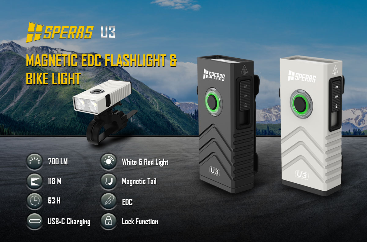 The Speras U3 Multifunctional Flashlight seamlessly combines rugged outdoor performance with everyday versatilityLightweight, portable, and built to last, this compact yet powerful flashlight is your go-to tool for any situation. Whether you’re cycling through the night, hiking in the wilderness, or handling everyday tasks, the Speras U3 is here to light your way.