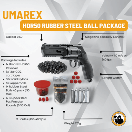 Grab this deal while it`s hot! Umarex HDR50 Rubber Steel Ball Package – this package includes 1x Umarex HDR50 Revolver; 5x 12gr CO2 cartridges; 50x Nylons; 6x Pepperballs; 1x Rubber Steel Balls 40 pack (.50 Cal) and 1x Red Fox Practise Rounds (0.50 Cal).